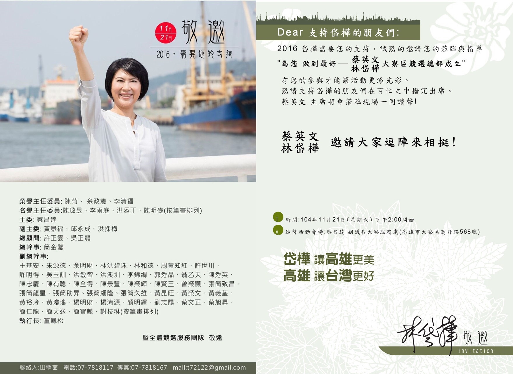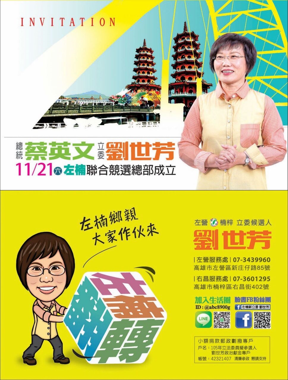 高雄市的立委提名候選人除賴瑞隆競選總部已經成立外,其餘八人都集中在11/21.11/22兩天舉行競總成立大會。 蔡英文主席都會蒞臨每一場成立大會和立委提名人一同造勢,邀請大家作伙來給小英總統和立委候選人讚聲,和我們一起努力達成「小英凍蒜.國會過半」的目標! 11/21(星期六) 08:30邱志偉|岡山區阿公店路二段122號,625-9981 09:30劉世芳|左營區文直路&至真路口(巨蛋旁),343-9960 14:00林岱樺|大寮區萬丹路568號(副議長蔡昌達服務處),781-8117 11/22(星期日) 08:30管碧玲|博愛一路&十全路口,313-7816 09:00李昆澤|三民區鼎力路&金山路口,347-6699 14:00許智傑|鳳山區南華路&保泰路口,768-5678 14:30趙天麟|苓雅區民權一路&興中路口,333-6868 16:00邱議瑩|旗山體育場,662-1015