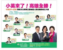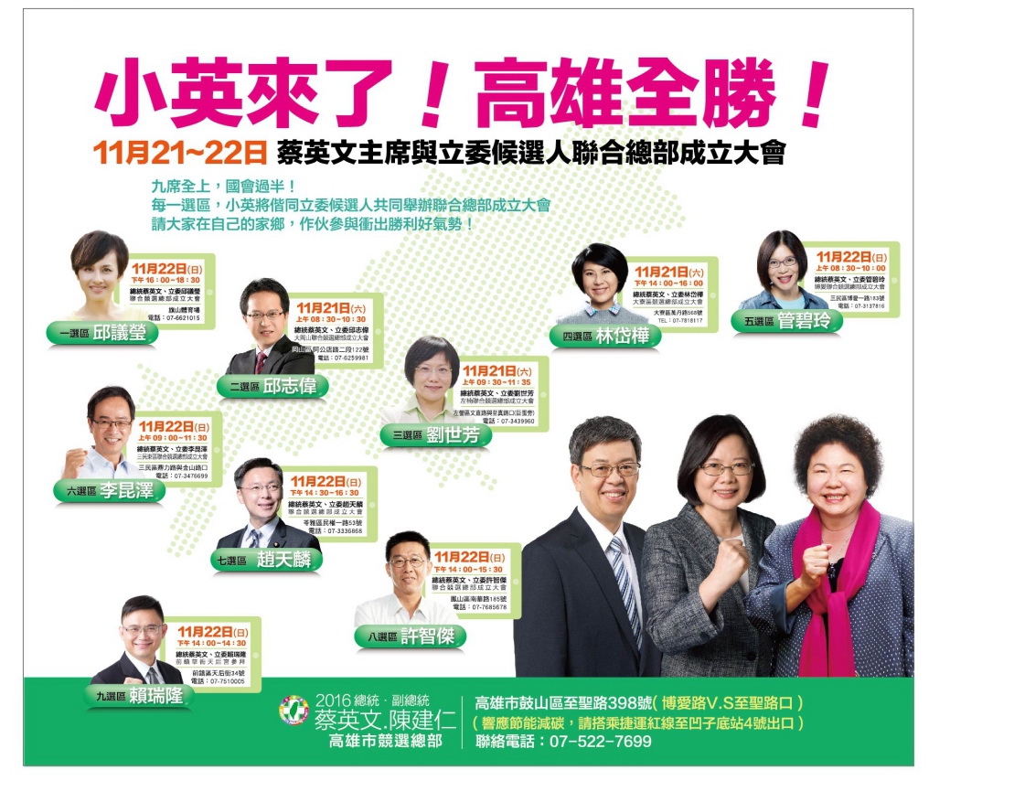 每一選區,小英將偕同立委候選人共同舉辦聯合總部成立大會 請大家在自己的家鄉,作伙參與衝出勝利好氣勢! 每場成立大會都有高雄市競選總部的「行動小英商號」攤位,到現場的朋友可不要錯過囉! 11/21(星期六) 08:30邱志偉|岡山區阿公店路二段122號,625-9981 09:30劉世芳|左營區文直路&至真路口(巨蛋旁),343-9960 14:00林岱樺|大寮區萬丹路568號(副議長蔡昌達服務處),781-8117 11/22(星期日) 08:30管碧玲|博愛一路&十全路口,313-7816 09:00李昆澤|三民區鼎力路&金山路口,347-6699 14:00賴瑞隆|前鎮草衙天后宮參拜 14:00許智傑|鳳山區南華路&保泰路口,768-5678 14:30趙天麟|苓雅區民權一路&興中路口,333-6868 16:00邱議瑩|旗山體育場,662-1015