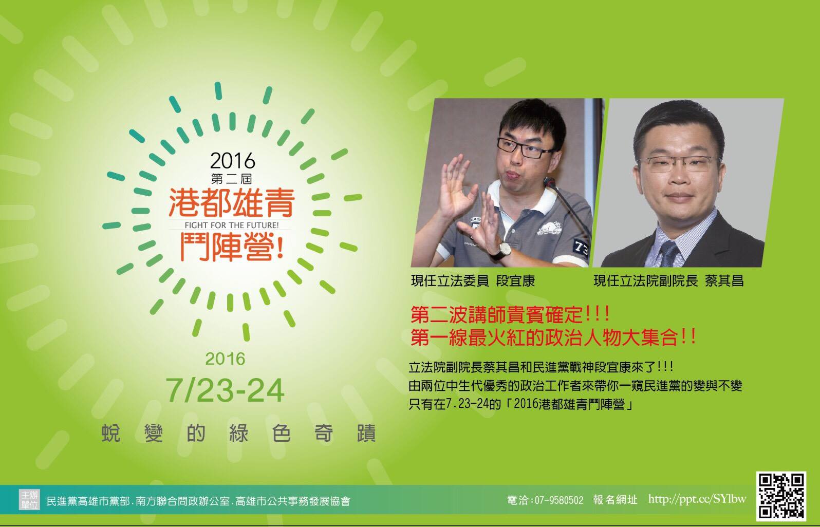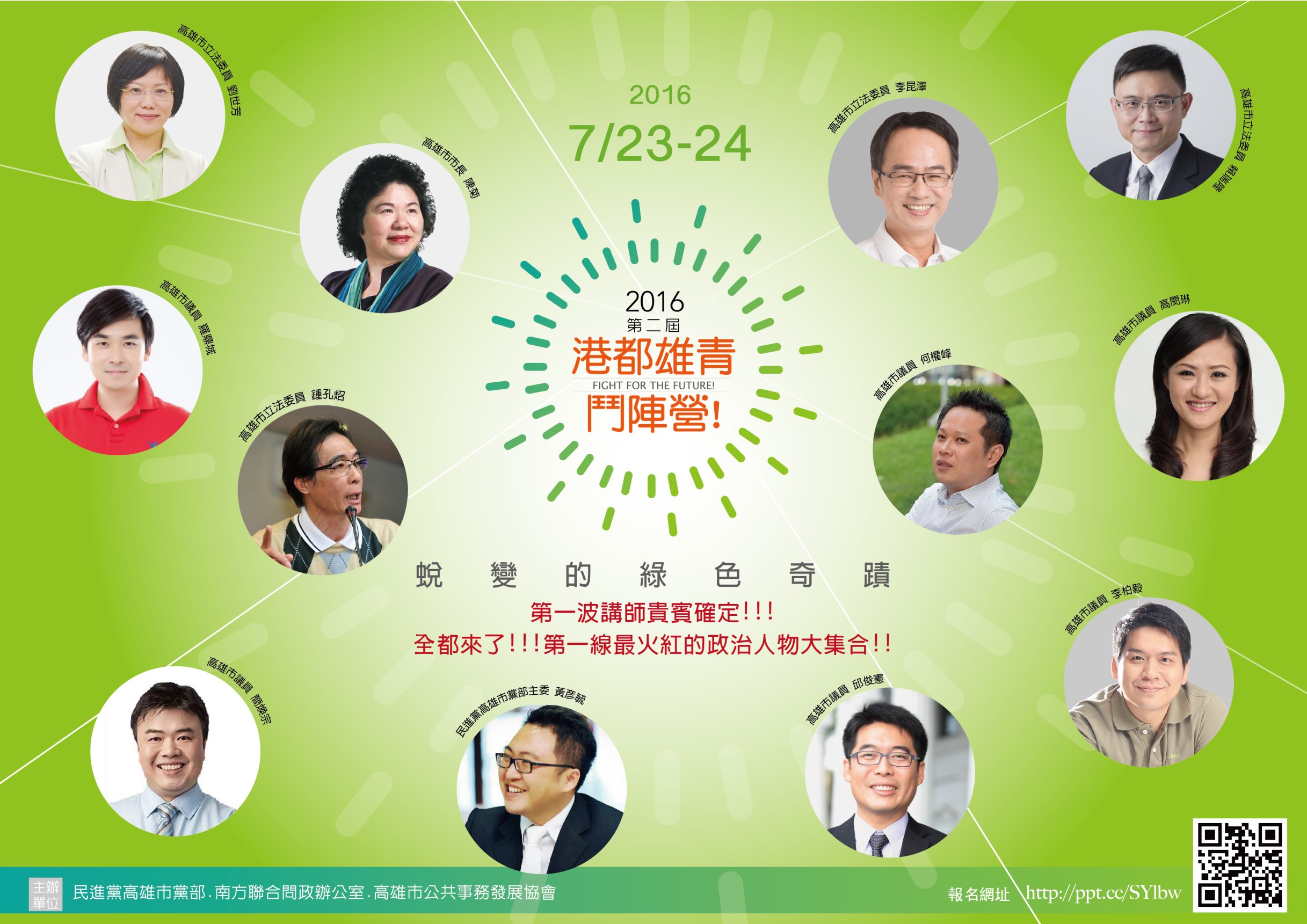 為吸引年輕人關心公共事務,培育青年人才,今年暑假民進黨高雄市黨部將與高雄市公共事務發展協會、南方聯合問政辦公室共同舉辦“2016港都雄青鬥陣營”,號召對政治議題及公共事務有興趣的青年們參加,7月23、24兩日將由高雄市長陳菊、立法委員蔡其昌、段宜康、民進黨青年部主任黃守達、民進黨台灣民主學院主任吳沛憶等眾多講師群,一同分享生命經驗談,從政歷程,傳授年輕人實踐政治的方法。 黨部主委黃彥毓表示,期望透過本次營隊的舉辦,吸引更多的年輕世代認識民進黨,打造Eparty,讓高雄市黨部持續推動世代合作,年輕化,和青年世代接軌;此外,舉辦此營隊也是為了讓高雄的年輕世代可以多一個機會了解學習公共事務及選務工作。透過陳菊市長及眾多講師群,和年輕人分享生活與從政經驗,讓年輕人對於自己的未來有更多的選擇與啟發。 協辦單位高市公共事務發展協會、南方聯合問政辦公室表示,年輕人對公共事務越來越關心,青年世代的聲音需要被重視,期望藉由本次活動可以讓青年了解政黨政治、公共事務的運作,增加國家社會與年輕世代的連結,進而了解民意,回應民意。目前除了已確認的上述講師,尚有部份神秘嘉賓確認中,另外還有針對哈瑪星地區漫遊的行程,活動內容相當豐富。 即日起至7月8日前受理報名,報名費每人新台幣2千元,全程參與者將於活動結束全額退費,營隊活動為期2天1夜,民進黨高雄市黨部歡迎年滿18~30歲各大專院校在學生與青年參加把握報名機會。報名請洽07-9580502或報名網站http://ppt.cc/SYlbw